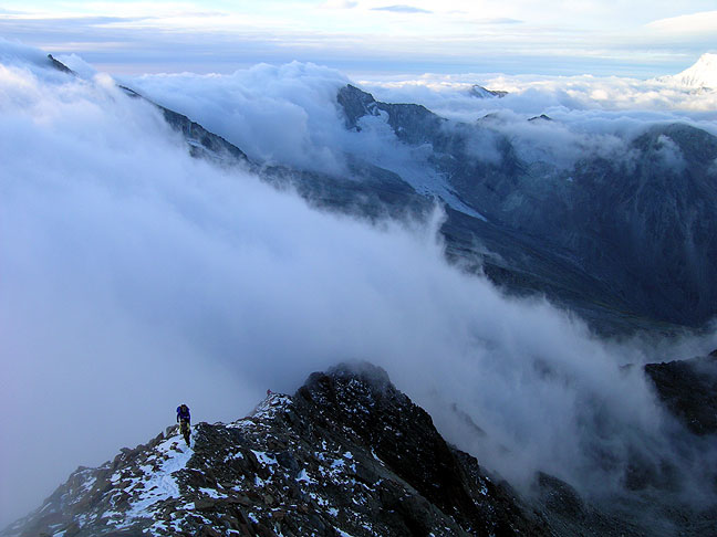 On the summit of the Weissmies. A large lenticular forms over the Dom and Täschhorn. |