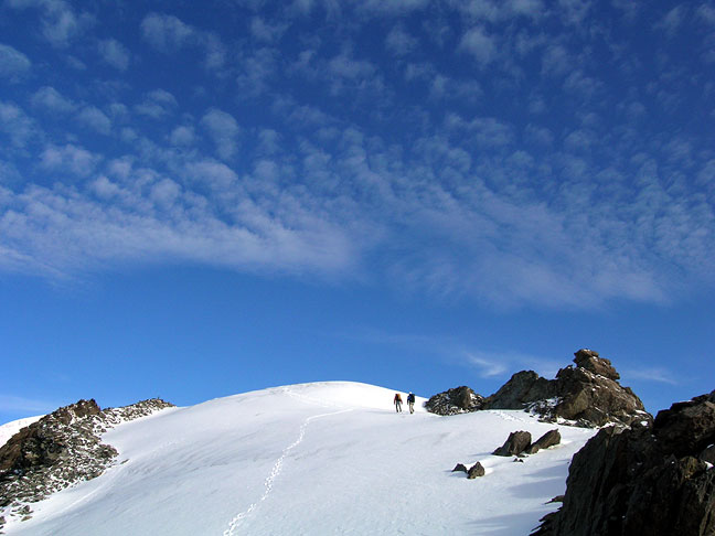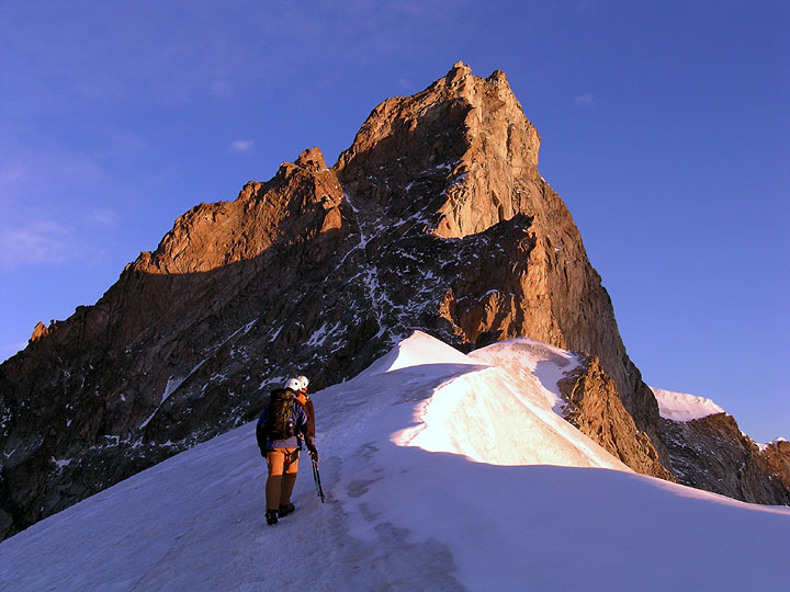 Approaching the Zinal Rothorn on summit day. The route, which climbs up to the notch in the lefthand skyline, then up the ridge, was in perfect condition. |