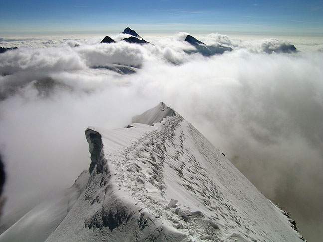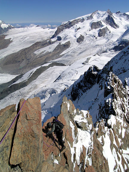 Looking down the SE Ridge of the Mönch. The Finsteraarhorn is the highest peak behind. |