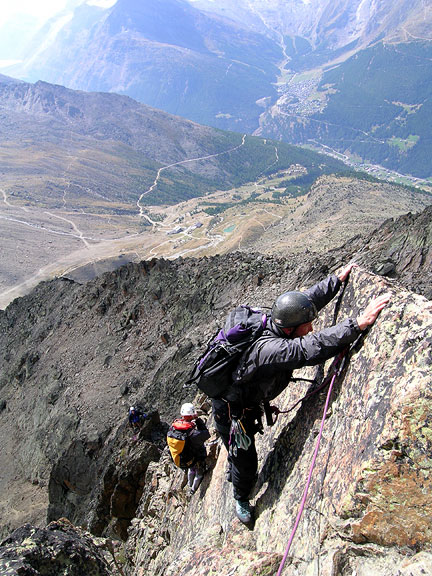 After our Breithorn adventure, we decided on a short rock climb of the Jegihorn, located above Saas Grund. Here we were joined by guide and friend Michael Silitch and his guest Pete. The Jegihorn is the peak in the background and the route we did, the South Ridge closely follows the lefthand skyline. |