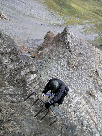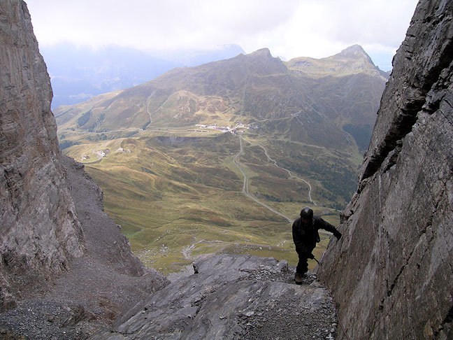 With a bit of time left on our last day (the day we climbed the Mönch) we decided to do a little Via Ferrata on the Rotstock, a rock tower not far from the Eigergletscher station. The route climbs up into this unlikely looking notch. |