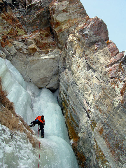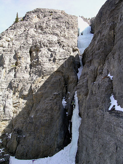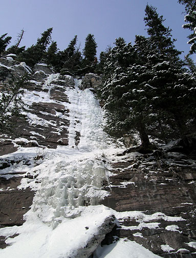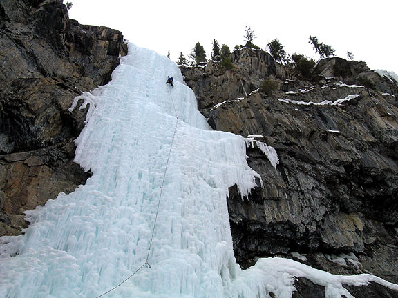 | This year, a thin smear of ice formed to the left of the main falls. This is a fun two-pitch route that goes at about grade 4. A bit thin in the bottom, the route becomes fat in the middle then thins again at the tip and narrows to an amusing more technical finish. |