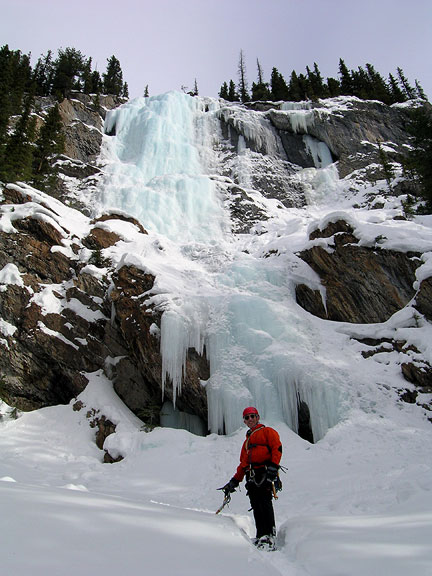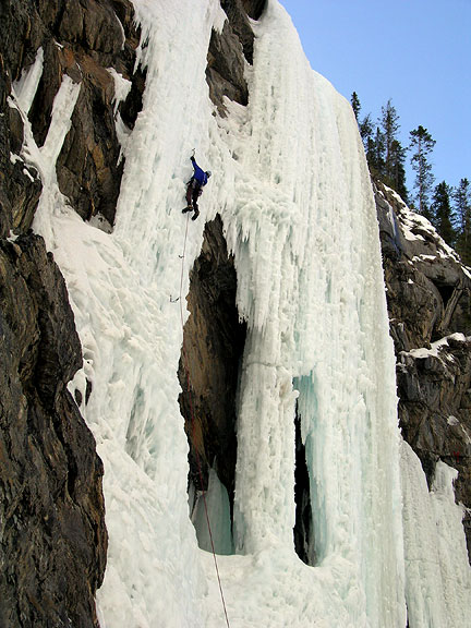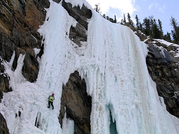 | For some 7 or 8 years Chris has come up to Banff for a bit a waterfall bashing. This year we explored a few new areas (for us) and were also joined by friend and colleague, Mike (rope gun) Powers for some of our climbs. The 2004 season was superb, with lots and lots of very fat ice. If ever was the time to tick off a few of the more challenging routes, while they were fat and "easy", this was the year. The weather was warm while we were there, but this only made the ice soft and agreeable. Avalanche hazard was a concern, and some routes were ruled out because of it. But there was so much that was good, that it hardly seemed to matter. |