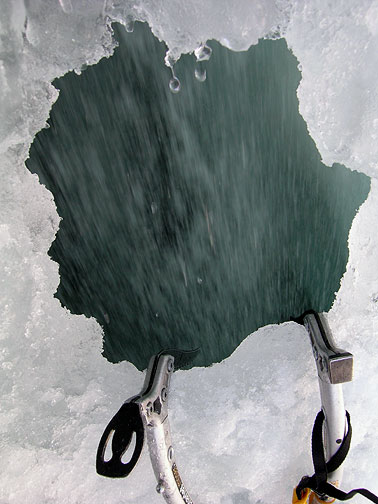 | There is always a lot of water running on Panther Falls. Just to the side of where we climbed we could punch through thin ice and look into a waterfall filled "elevator shaft". Falling into one of these is a nightmare I hope never to experience. To the side the ice was nice and thick. |