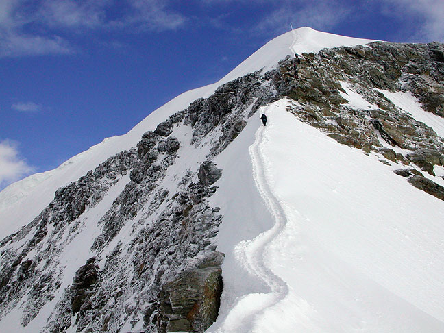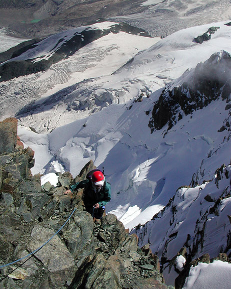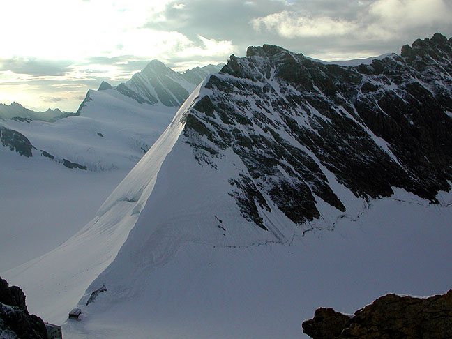 | Looking back at the neatly etched north ridge of the Trugberg, in early morning light. The Gross Fiescherhorn appears behind it on the left. |