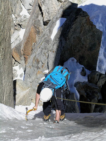 David down-climbing in the ice gully between the towers. This is a little variation on the route, that is lots of fun. Most folks avoid this section. In the previous photo you can see the gully between the giant towers. |