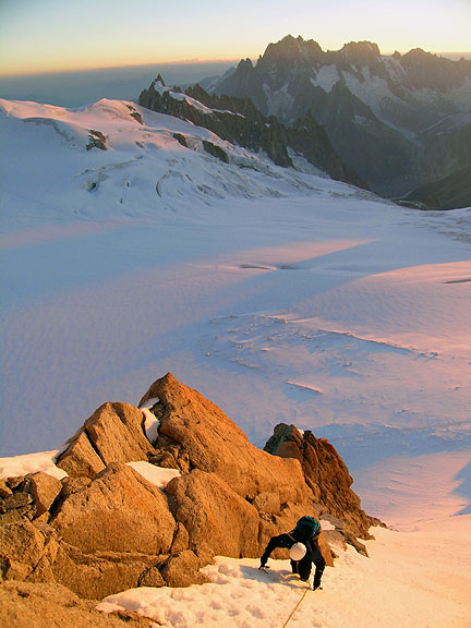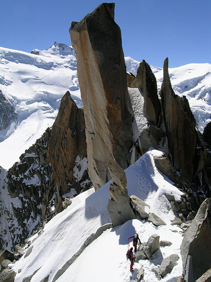 | On our first day of climbing we did a bit of a "warm-up" on the Arête des Cosmiques. Though David has done this route before it is always fun and he was keen to do it another time. |