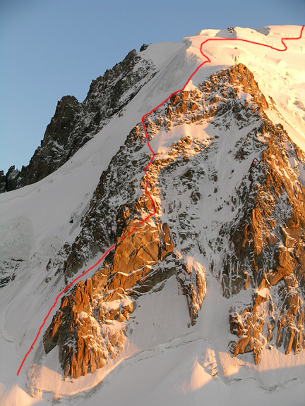 Our objective for the next day is the Contamine-Grisolle route on the North Face Triangle on Mont Blanc du Tacul. I have drawn in our route. |