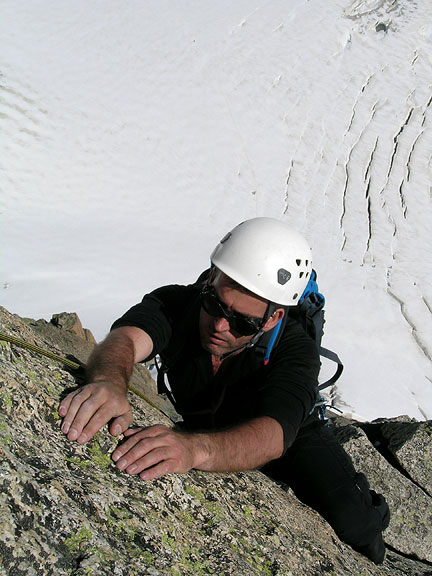 | David on the crux section of the Pyramide. |