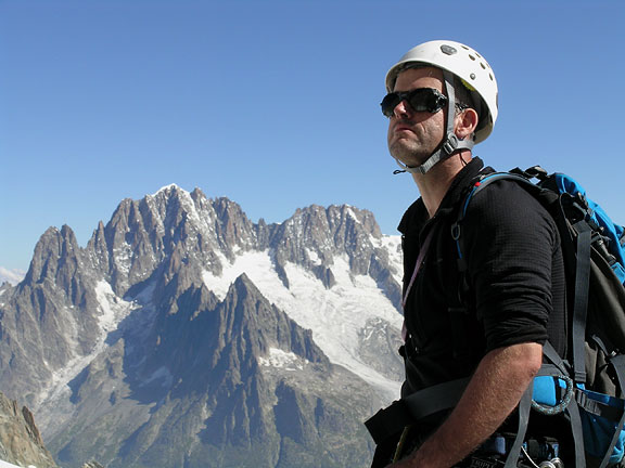| The summit hero shot on the Pyramide. The big peak behind is the Aiguille Verte. Les Drus is the double summitted tower on the left and Les Droites is the peak to the right of the Verte. The Aiguille du Moine is the nice looking summit in front of the Verte. |