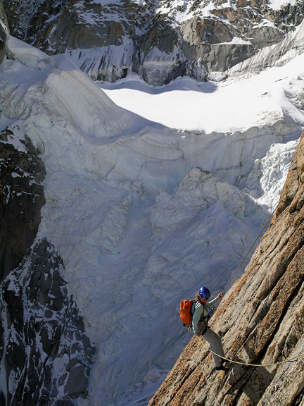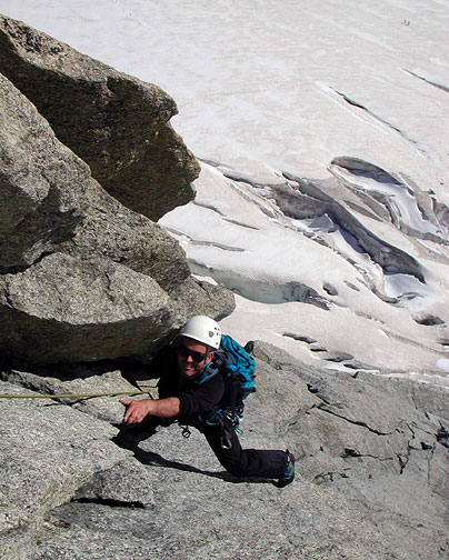 | David climbing high on the route. You can just make out he dots of walkers on the glacier, far below. |