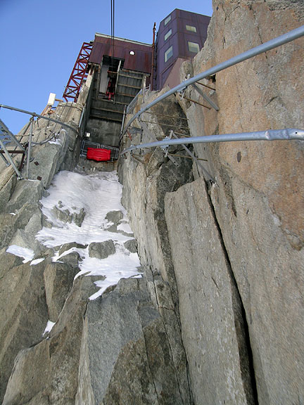 | I shot this photo out of a wee window in the Aiguille du Midi cable car lift, just as it was arriving at the top station. Notice the dents in the bar on the right! I suspect it was pretty windy the day those were put in. |