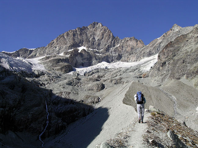 | Nest we decided to take advantage of the good weather and conditions and to a great classic, the Arbengrat on the Ober Gabelhorn. In this photo we are hiking up to the bivy hut below the peak. The route climbs the thin couloir to the ridge left of the top, then follows the crest to the summit. |