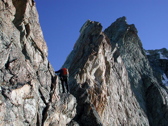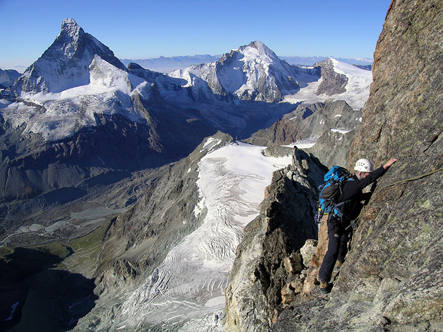 | David climbing along the Arbengrat. Here we turned the first small gendarme by an exposed traverse on the right. The Matterhorn and Dent d'Herens are the big peaks behind. |