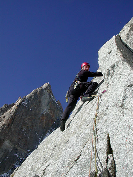 | For our third day, Kath joined us for the East Arête of the Pyramide du Tacul, a fun rock climb on great granite. Kathy took this photo of me(Mark) leading, low on the climb. The Petit Capucin is the tower in the background. |