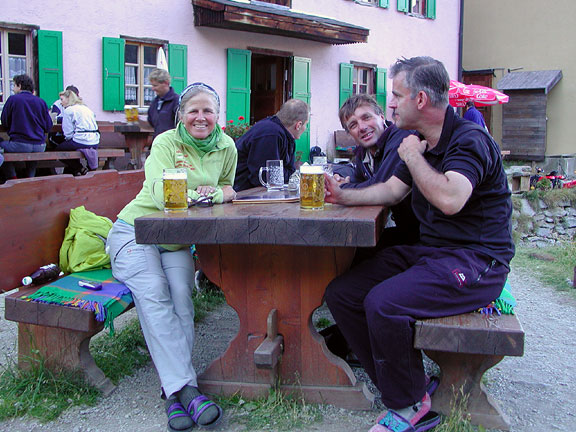 | We hiked on down to the Rothorn hut, then continued down to the Trift Hotel for the night. Here we enjoy a well earned beer. |