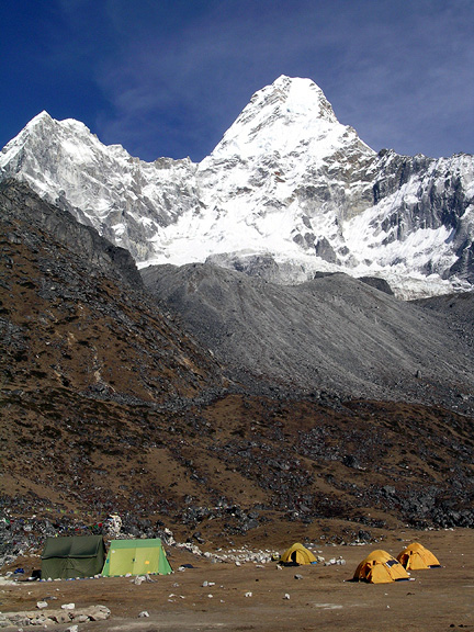 | Our camp under Ama Dablam. By now you can recognize the tent scheme. Our route, the SW Ridge, is the right skyline. |