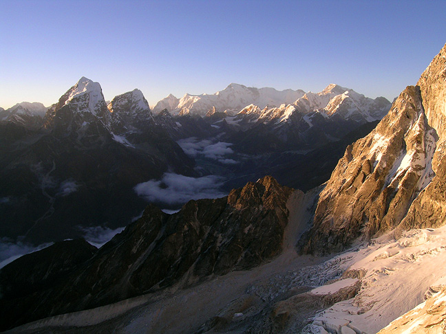 | Sunset from Camp One. Cho Oyu is the broad peak in the distance. Tawache and Cholatse are the sharp summits on the left. |