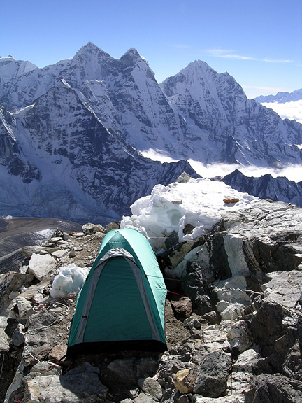 | Camp Two. The tents get smaller as we have to carry them higher. We never actually occupied this camp as Emery's cold never went away, and continued with a bad cough and general tiredness. |