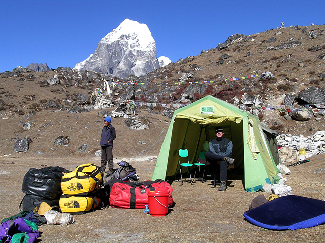 | But in the end illness got the better of us, and we were forced to retreat back to Base Camp. Here we are, packed up ready to go. Pasang looks for arriving yaks while Emery enjoys tea in the dining tent. |