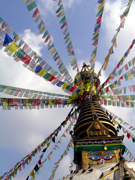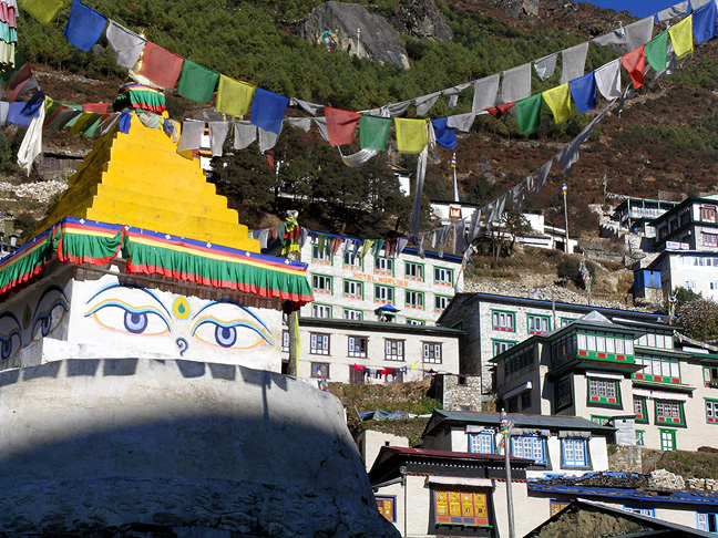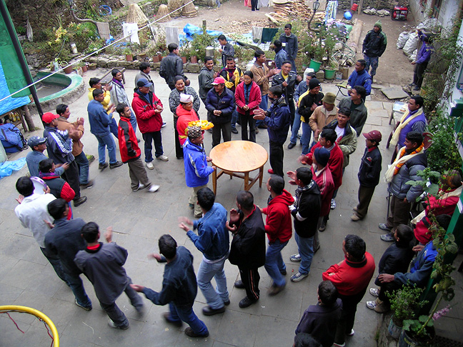 | The last day of the trek out coincided with a Nepalese festival called Tihar. As part of the festivities, singers would go house to house, do a dance and a song (singing the praises of the houses owners) and the owners, in turn, would bring out a large tray of sweets and tasty baked goods, lined with many rupee notes. |