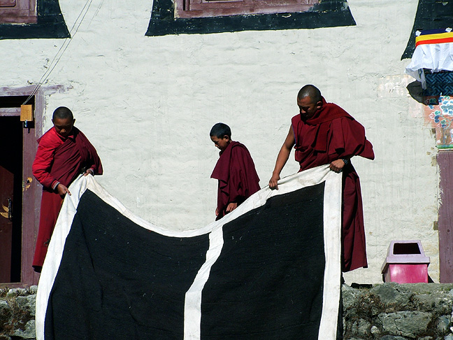 | We trekked in to the Khumbu via the usual itinerary used by trekkers to Everest Base Camp and Kala Patar. Here we are enjoying a sunny morning at the Tengboche Monastery, where monks appear to be drying out some draperies. Photo Andy Latham |