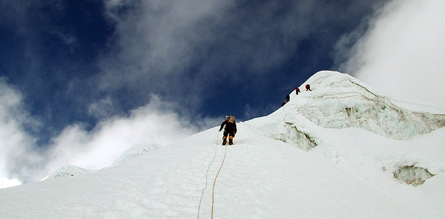 | The steepest part of the climb was not extreme, but rather exposed. Fixed lines both hindered and helped; causing bottlenecks on the ascent, but also a quick way off on the descent. Photo Andy Latham |