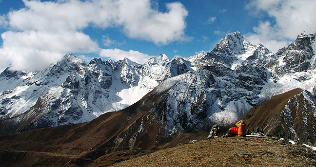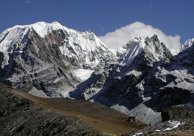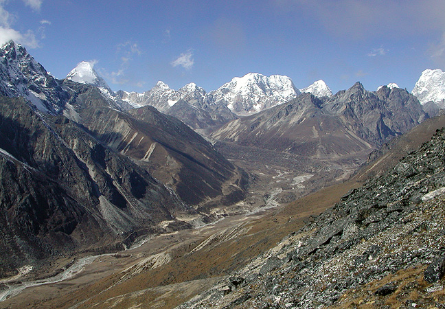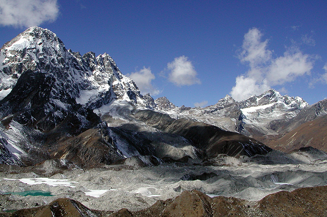 | After our ascent of Lobuche East, we trekked westward over the Cho La, shown here as the low-lying flattish glacier just left of the center of this photograph. The day we crossed the pass was very foggy, so we missed many of these views until our view-finding hike the following morning to a hilltop high above our resting place in "Tarngnok" (Kathy's best guess at spelling the name of this place, which she had to ask Mingma about a million times). |