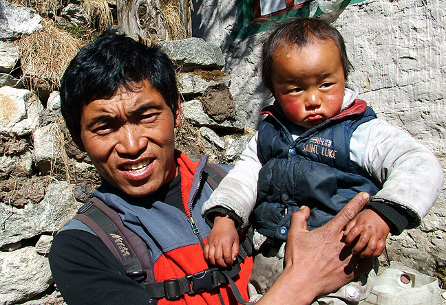 | Our fearless leader on this trip was Mingma Sherpa of Thame, shown here with a nephew. Mingma has an impressive mountaineering resume, including multiple ascents of Everest by numerous routes, and climbs of difficult and rarely climbed peaks throughout the Khumbu, as well as at least one expedition to Pakistan. He was a tireless, cheerful leader, adaptable and capable, and a fantastic cook as well! We felt very privileged to have him caring for us. Photo Andy Latham |