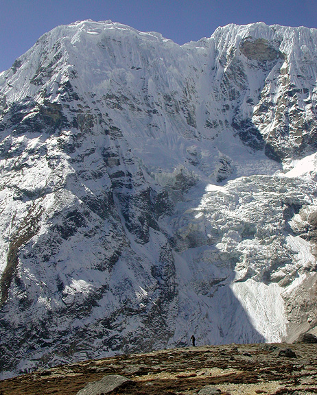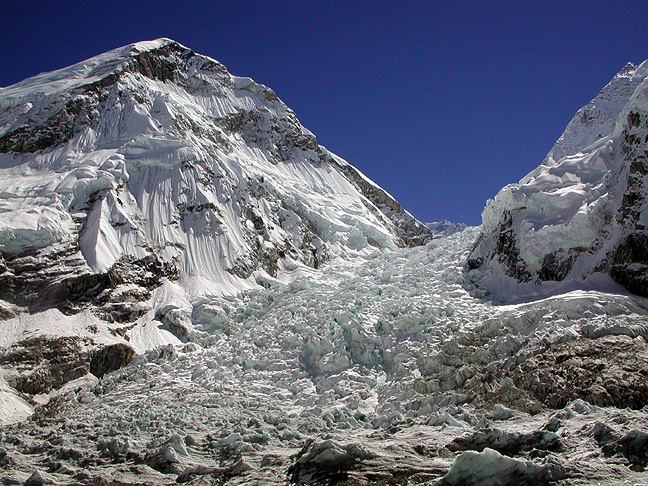 | We made a major side trip up to the Everest Base Camp, which was utterly deserted in this late autumn season. This is a view up the infamous Khumbu Icefall. |