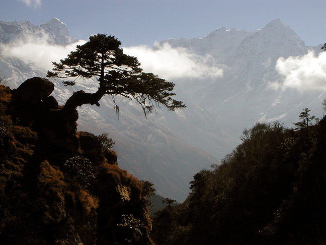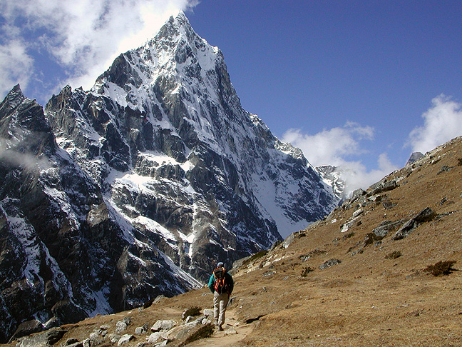 | At last it was time to head out via Namche Bazaar; this photo taken between Thame and Namche, with again Kusum Kunguru (Kathy thinks) in the background. |