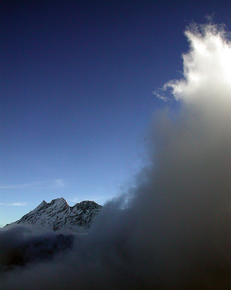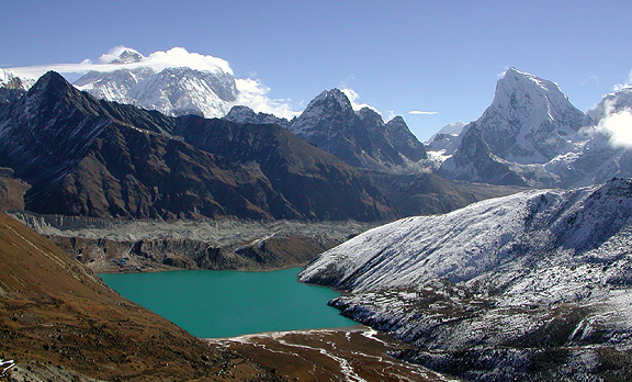 | We spent two nights at Gokyo (tiny, but visible here if you have strong reading glasses, at the upper left edge of the Gokyo Lake), in order to climb Gokyo Ri with its famous views. This photo however was taken not there, but on our way out of town, on the climb up to the Renjo Pass to the West of Gokyo Lake. Everest is looking abominably cold with its scarf of cloud; to the right the dramatic left-leaning peak is Cholatse. |
