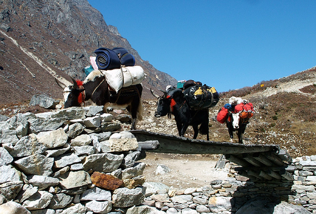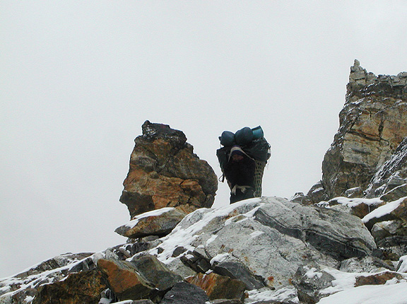 | The morning of our trek over Renjo Pass started out sunny, but once we crossed to the West side we were immediately engulfed in fog. A coating of new snow and the stamped in footsteps of other trekkers and their porters, made the footing on the steep descent seem treacherous enough for us. But in typical Sherpa fashion, porters made it look if not easy, at least remarkably graceful despite their cumbersome loads. |