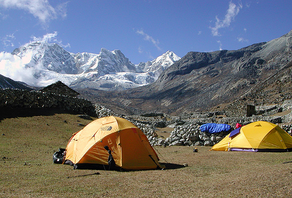 | Our idyllic camp in Chiutungbo with an awe-inspiring view of a barrier of peaks to the West, forming the division between this valley and the Rwaling peaks further West. Mingma told us the Sherpa guides and porters do mountaineering training among the icefalls of these glaciers; a fantastic playground that sees few other visitors. |