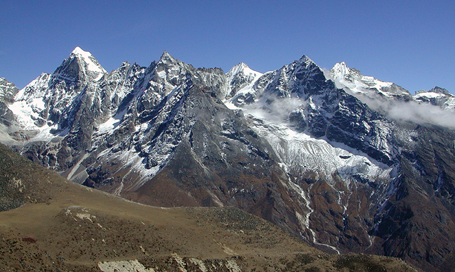 | We crossed the main valley and ascended to the West up another drainage, to a deserted hamlet of herdsman's cottages called "Chiutungbo". Yet another hill-top viewpoint gave us a great view of Kyajo Ri (on the left) and the ridgeline of peaks extending southward from it, including "Peak 3118" in the center of this grouping. |