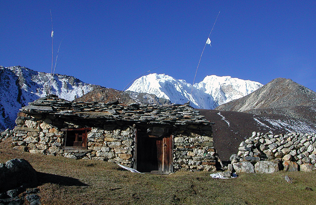 | We descended to a small, quiet village with one teahouse, called Lungden. It too had a nice hill-top view point above; we checked it out during the sunny hour or two of the following morning. Here we are looking northward up the valley toward the Nangpa La. |