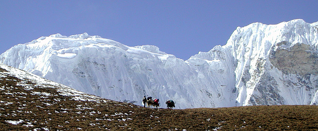| In October and November of 2005, Andy Latham joined Kathy for a different kind of trip in Nepal. The goal was to climb one or more peaks and see a lot of territory, hopefully leaving the beaten track and crowds of the Khumbu at some point to access more remote parts of the area. The main goal was to explore and hopefully climb Kyajo Ri, a peak newly opened for ascents by the Nepalese government. Information about previous ascents, if any, was sparse, and with only a few distant photos and a name on a map to guide them, they set out to see what they could do. The plan involved an ascent of Lobuche East to acclimatize, and a traverse over two high passes: Cho La from the Khumbu valley to the Gokyo Valley, and then further westward, Renjo La from the Gokyo valley to the wide valley down which the Tibetan traders descend to the market in Namche Bazaar. Up this valley lies the Nangpa La, the pass at the border with Tibet. Three years earlier, Andy had seen this pass from the Cho Oyu base camp during another expedition with Mark and Kathy. |