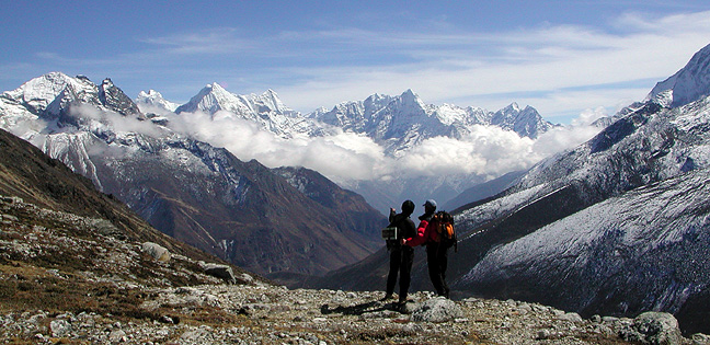 | The following day essentially began our return journey toward Lukla. We first headed back toward Thame, Mingma's home village, where we looked forward to his hospitality and visits at some smaller monasteries. This view shows us still a long way above Thame; here we are looking at the peaks above Lukla on the right; above Andy and Mingma's heads is Kusum Kunguru; to its left is Tamserku, the snowy double-summitted peak in the background is Kangtega. |
