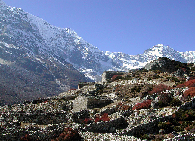 | After a rest day in Chiutungbo, we headed Westward still more, to round the corner of a ridge dividing us from another seldom-visited village further to the south, on our way to Thame. This hike afforded us incredible views of the giant East faces of these peaks. Most of their names are unfamiliar to trekkers in the Khumbu, who rarely see them. |