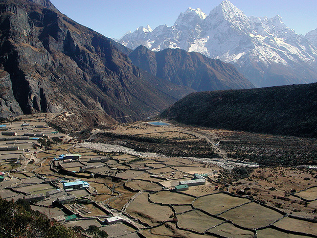 | From above, you can see the layout of Thame, with its holding pond for the 600 kilowatt hydro-electric facility which provides power to the surrounding towns including Namche Bazaar. |