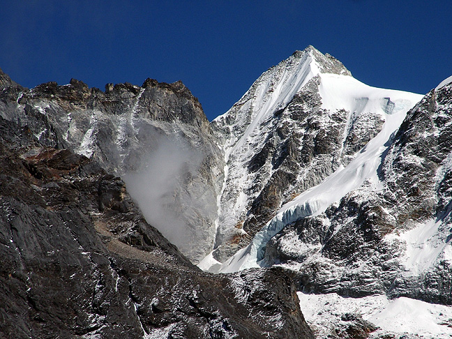 We had already seen enough of Kyajo Ri to strongly suspect it was too much for the time remaining to us. We had spoken with an American climber who had climbed another unnamed peak nearby, which we called simply "Peak 3118", shown here. After a discouraging reconnaissance hike, we decided with Mingma's help, to use the rest of our time to explore a side valley and visit his home in Thame before our time ran out. Photo Andy Latham |