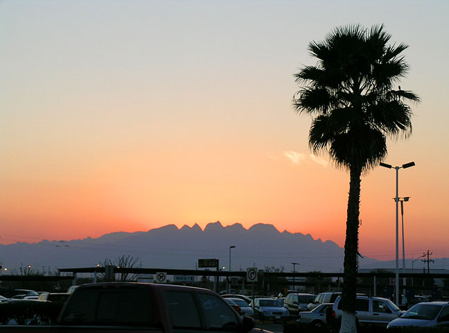 | Sunset from the Monterrey airport. When we arrived temperatures where much higher than normal, well into the 80's F. There are lots of mountains around Monterrey, and here, the sun sets over those to the west. |