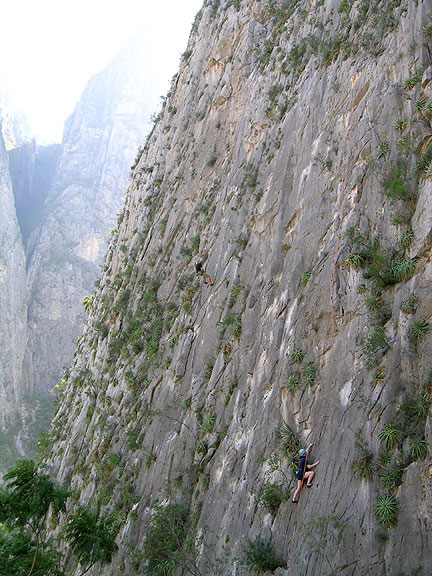 | Climbers on the first couple pitches of Space Boyz. This route starts with about 4 pitches of 5.9 or so, then a few steeper sections, with a challenging 5.10d pitch and a sneaky 5.10b pitch before easing again on the upper part. On our last day, we climbed another great route, the Treasure of the Sierra Madre, a seven pitch 5.10c route with great bucket pulling and crack climbing. |