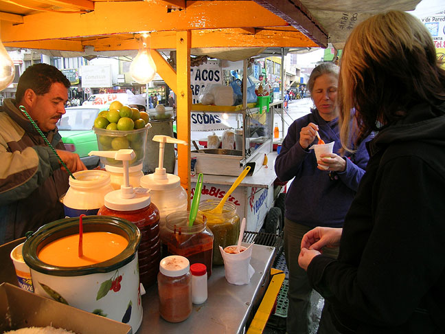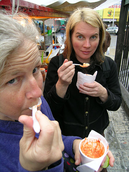 | A roadside stand selling steamed corn, fresh off the cob, with all the "trimmings". Penelope and Kathy experiment a bit. |