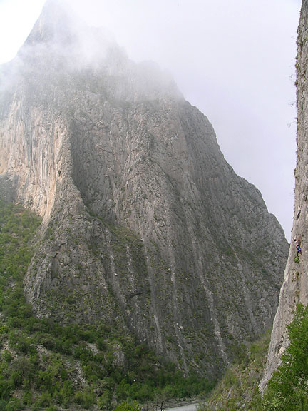 | The weather cleared again, and we took a day at the Mota Wall area, a fun place for both short and multi-pitch routes. Most of the climbs are on the lean rock on the lower right. But we also did a 6-pitch route (Dope Ninja, 5.10b/c) which follows the ridge to the "Snot Girlz" tower. |