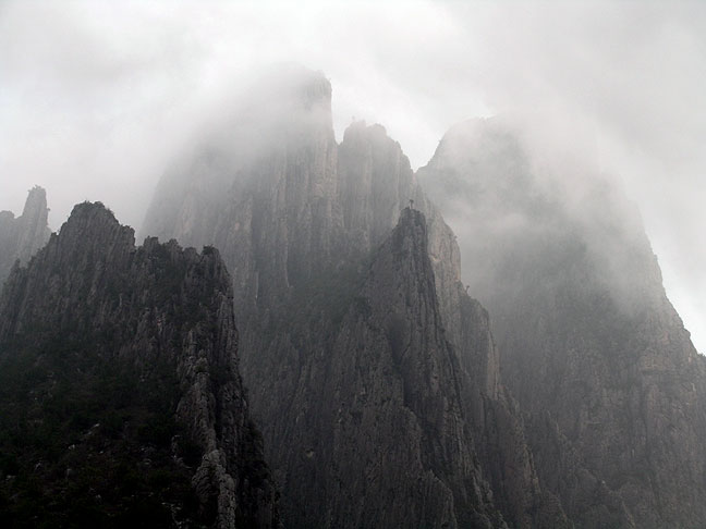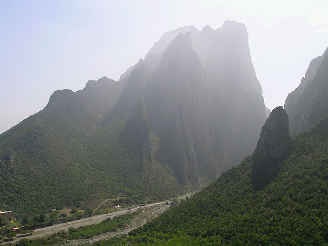 | The geology of the area is quite interesting. The entire area around Monterrey was once a great seabed, now turned to deep limestone deposits. Folding of the strata followed tipping many of the horizontal beds on end. One big fold formed a synclinal mountain, who more shattered interior rock was eroded away, leaving a giant crater. The "crater" has an outlet through the narrow gap of the Potrero. In this photo we are looking up at the rock towers on the east side of the gap. |
