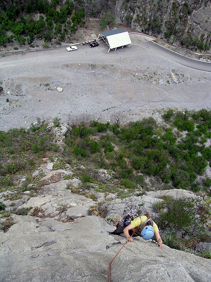 | Kathy on the first 5.10 pitch of Dope Ninja. |