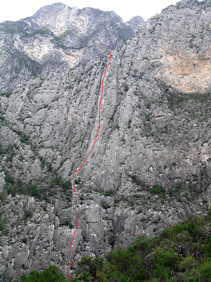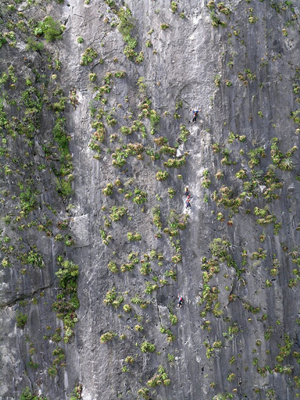 | The "Jungle Wall" as seen from near the Mota Wall. On our second to last day we climbed Space Boyz, a Potrero classic. The route follows the widest swath seen here in some eleven pitches. |