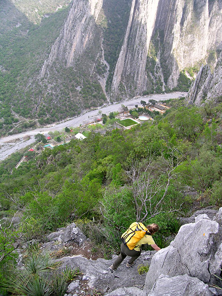 | We took a busman's holiday and spent about 10 days in Potrero Chico, a fun rock climbing locale near the Mexican city of Monterrey, just southeast of the southern tip of Texas. This was our first visit to Potrero and we had a blast. For the first few days we were joined by Mark's rock-star sister Penelope Houston. She is much better known for her musical accomplishments than her climbing skills, but she did join us on a few steep pitches. You should check out her web site at penelope.net. We had a few days of rain, but this gave us good excuses to check out Monterrey, as well as some very pleasant hot spring about an hour's drive north from Hidalgo, where we stayed. We owe a "thanks" to Ian, from Albuquerque for driving us to this rather remote location. |