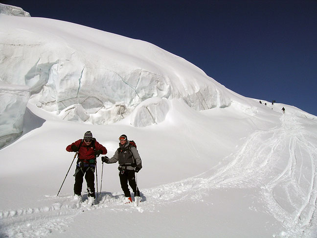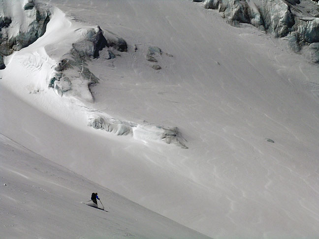 | Descending fine snow on Haute Glacier d'Arolla. Behind we can see the Col du Mont Brulé, our next pass. |